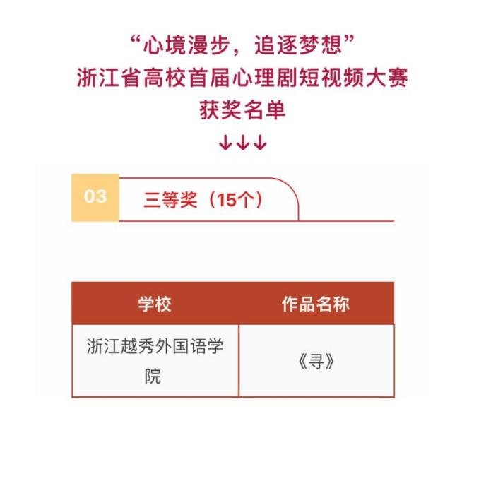 为进一步推进我省高校心理健康教育工作,丰富“5·25”心理健康育人载体,浙江省高等教育学会思想政治教育分会、浙江省高校心理咨询工作联盟主办,浙江中医药大学、浙江旅游职业学院承办的“心境漫步,追逐梦想”浙江省高校首届心理剧短视频大赛。来自全省101所本科、高职院校投稿参赛,经专家评选,最终评选出获奖作品30个,并于5月25日心理的节日公布结果。我校推送的学生原创心理短视频《寻》脱颖而出,荣获三等奖!
